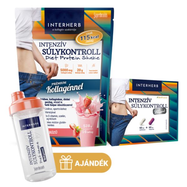 • Interherb Intenzív SÚLYKONTROLL CSOMAG É&N+Shake Eperízű + ajándék Shaker